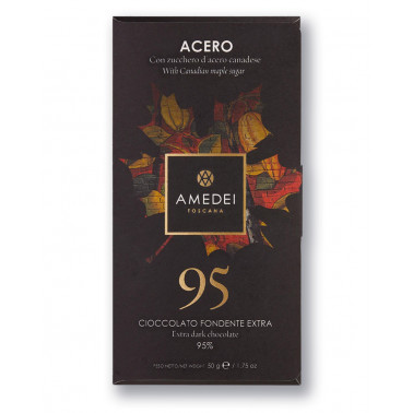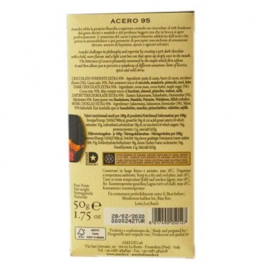 Acero 95, el chocolate más intenso de Amedei que recoje la tendencia en la chocolatería bean to bar europea de altos porcentajes. Es un blend que nace de una mezcla de distintos porcentajes de cacao Trinitario y Criollo procedente de plantaciones seleccionadas por Amedei en Venezuela y que se mezcla con un 5% de azúcar de arce para matizar su sabor.
