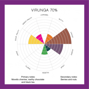 Procedente de un cacao raro cultivado por una comunidad en las montañas del Parque Nacional Virunga.
