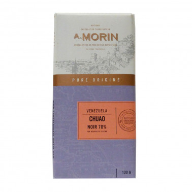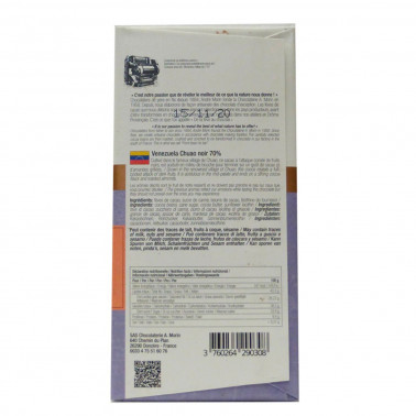 El mundialmente famoso cacao de Chuao tiene su interpretación es esta tableta al 70% en la que se aprecian las notas de fruta negra al inicio, cacao, ligera fruta acida y almendra tostada al final.