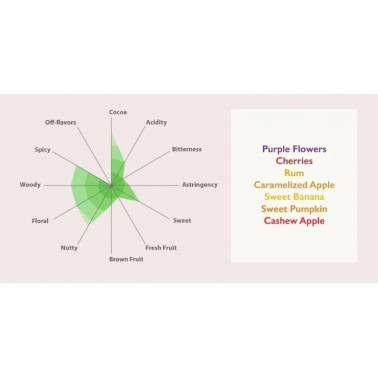 Así se obtienen habas de cacao con características que dan lugar a un chocolate menos fresco que Saloy, mas intenso con notas de manzana caramelizada, ron, banana y anacardo.