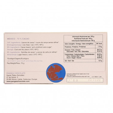 Pangea añade un poco de azúcar de caña y trabaja el cacao con respeto por el sabor original. Sin lecitinas ni manteca de cacao.