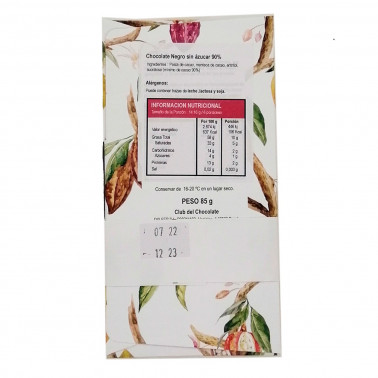 Es un chocolate al 90% de cacao, edulcorado, que nos ofrece notas de cacao, fruta y galleta.