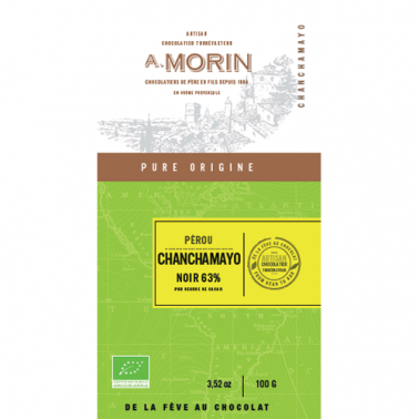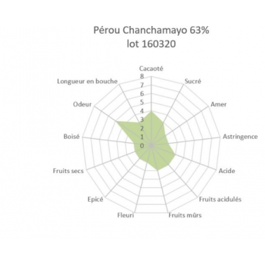 Este chocolate 63% presenta las características de este cacao afrutado y ácido al inicio, para terminar con una nota ligeramente picante.