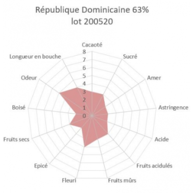 Este chocolate 63% es ligeramente acidulado, floral y un punto terroso.
