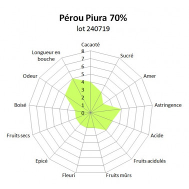 Es este cacao ácido y mantecoso contiene un 35 % de granos blancos. Es un chocolate con aromas frutales y un toque de cacao intenso.