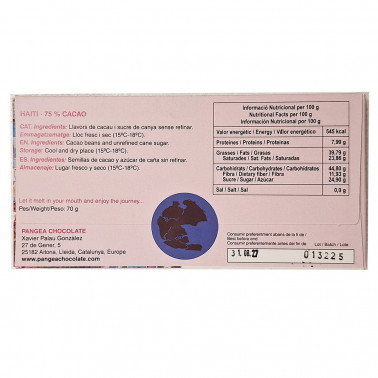 Pangea añade un poco de azúcar de caña y trabaja el cacao con respeto por el sabor original. Sin lecitinas ni manteca de cacao.