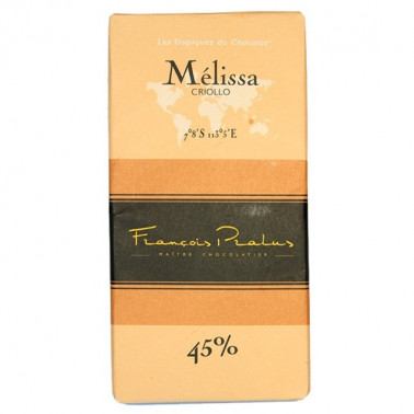 Chocolate con leche Melissa de Pralus, criollo, de plantación única. Una propuesta para los amantes del chocolate con leche que tiene un muy alto contenido en cacao (45%) Buena intensidad aromática y presencia equilibrada de notas de miel y de caramelo.
