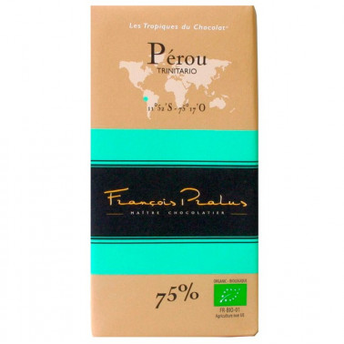 Para este chocolate, Francois Pralus desarrolló una mezcla de granos de Perú. Las propiedades aromáticas de los granos de Trinitario llegan en esta variedad de Perú al nivel de cualquier criollo. El resultado es un chocolate redondo, largo final con buenas notas aromáticas.