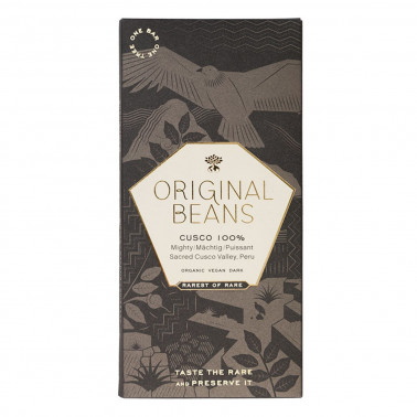 Chocolate negro 100% elaborado con cacaos de Valle de Cuzco, en Perú, mítico por su cultura desaparecida y en el mundo del chocolate por sus cacaos puros y aromáticos.