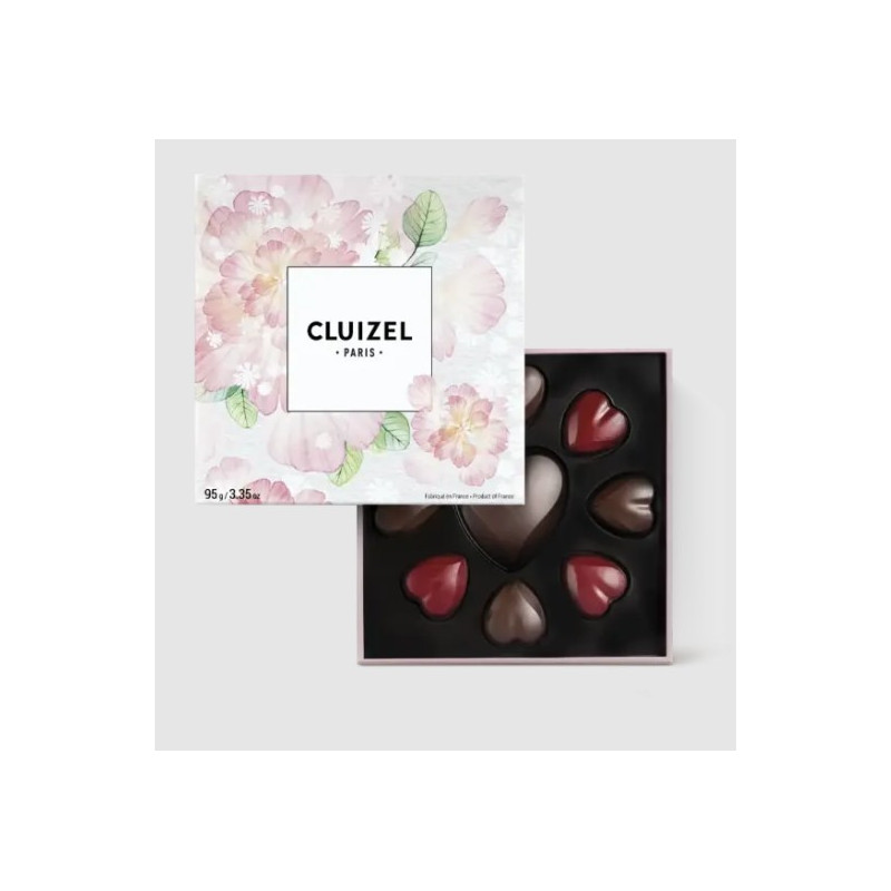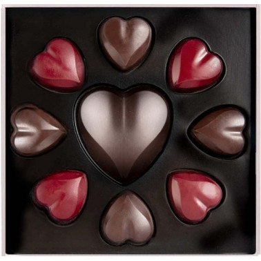 Un surtido de bombón francés Michel Cluizel diseñador para celebrar el amor. 10 bombones diferentes en chocolate negro o con leche y 1 nuevo bombón de praliné de frutos rojos.