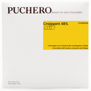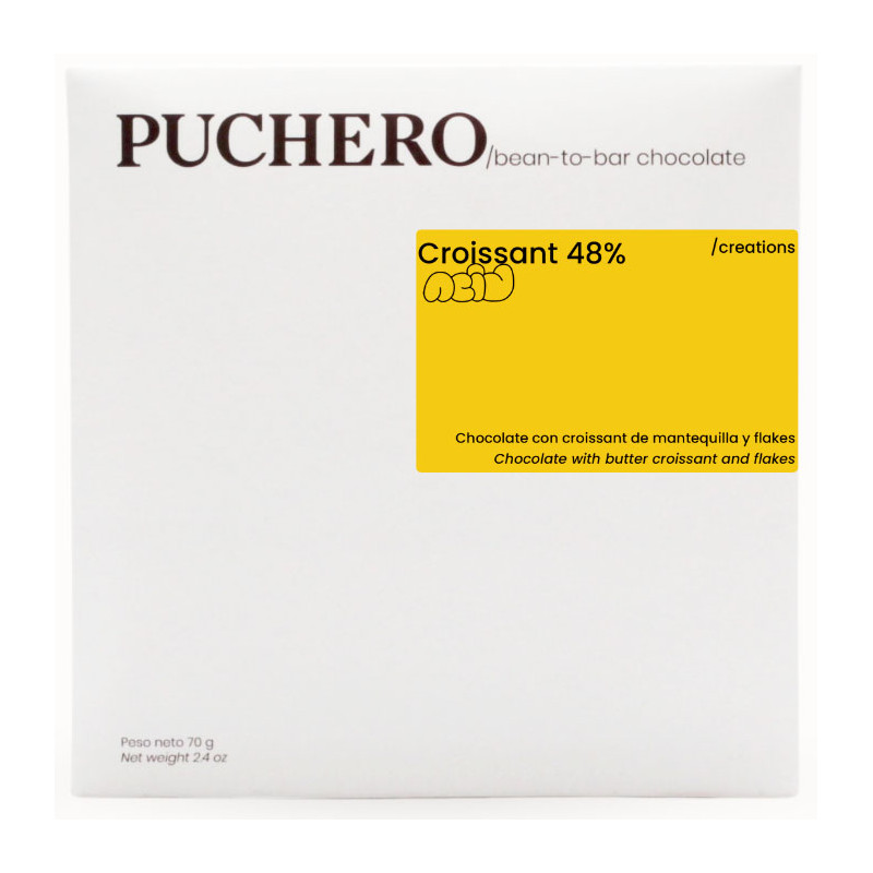 Esto es lo que Puchero consigue con cacao El Zorzal de República Domininicana y medio croissant que encontrarás en flakes en la trasera de la tableta, elaborado en colaboración con Acid Bakehouse Madrid que crea un croissant hojaldrado de alto nivel.