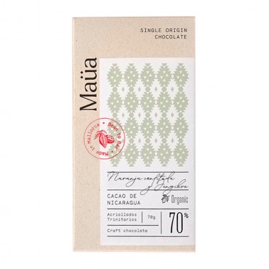 A un buen cacao de Nicaragua, Mauá se añade naranja de Soller confitada que junto con el cacao conforman una tableta con inclusiones redonda.