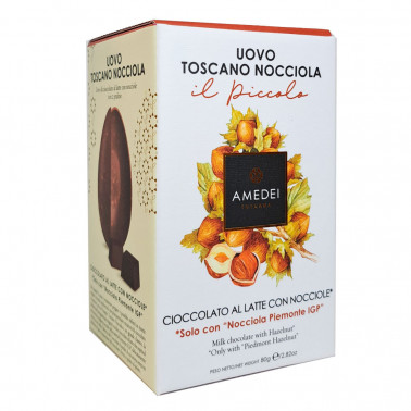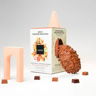 Huevo de Pascua con el chocolate clásico de Amedei con base de chocolate con leche y las famosas avellanas del Piamonte. La receta es un verdadero clásico, que en esta versión pretende recrear un regusto de larga duración. La dulzura del chocolate con leche se aliado con la avellana tostada.