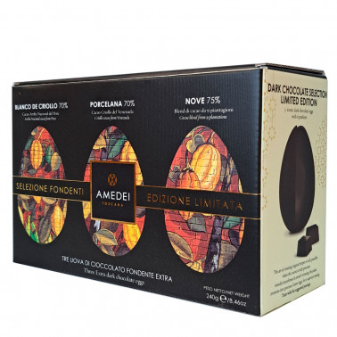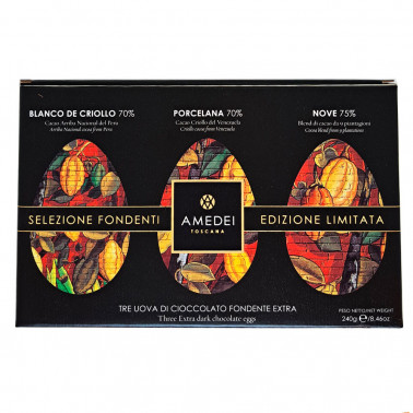 La posibilidad de regalar un pack con 3 huevos de Pascua de 80 gramos, que corresponden a tres maravillosos chocolates emblemáticos de la casa AMEDEI: