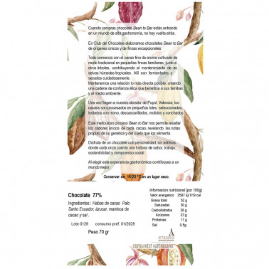Hacienda Palo Santo 77% con Sal en escama, chocolate bean to bar