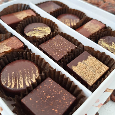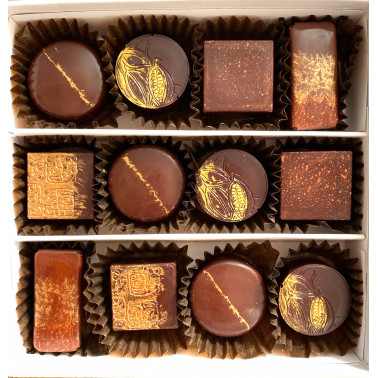Con esto, nos podemos permitir ofrecer esta caja de 30 bombones en los que hemos combinado las coberturas de origen y los rellenos de ganaches del mismo origen con algún matiz que resalte los sabores propios del cacao. Seguimos así la tradición de la alta bombonería francesa donde se pone en valor el matiz del cacao y se complementa con especias para realzar las notas propias.