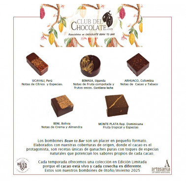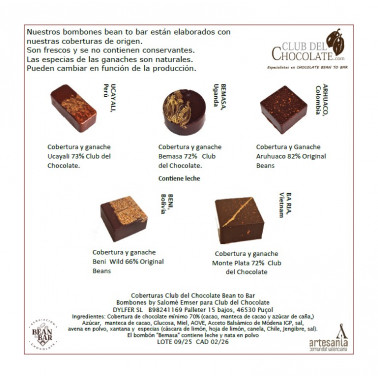 Nuestros bombones bean to bar están elaborados con nuestras coberturas de origen. Son frescos y se fabrican con consumo preferente 3 meses. No contienen conservantes. Las especias de las ganaches son naturales.