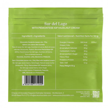 Cacao en grano Sur del Lago , Azúcar de caña, Manteca de cacao. Relleno: Avellana piamontesa IGP, Cacao en grano Sur del Lago, Azúcar de caña