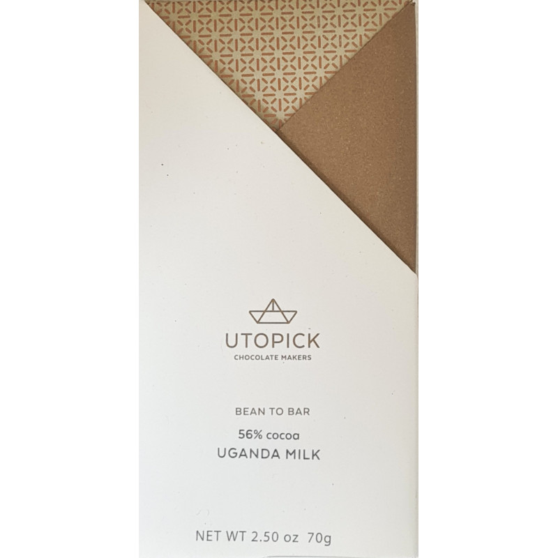 Utopick trabaja un cacao de Uganda, de la zona de las montañas Virunga, en el que destacan notas de fruta roja, combinándolo con un toque de leche. Técnicamente es un chocolate "negro" por su alto porcentaje 56% pero la leche le aporta cremosidad creando una combinación de sabor y textura muy interesante.