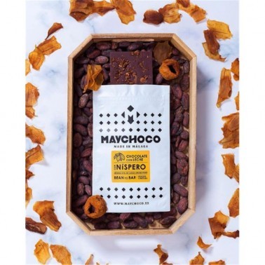 Ingredientes: habas de cacao, azúcar de caña, leche en polvo, manteca de cacao, níspero 10%