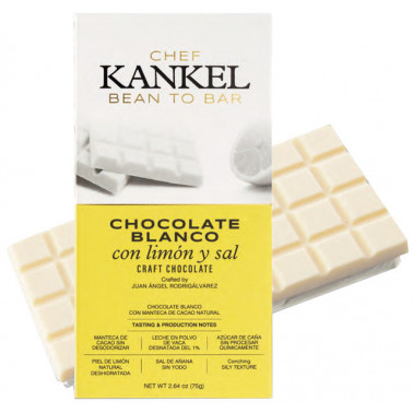Este está muy rico, con un alto porcentaje de manteca de cacao natural sin desodorizar, piel de limón, leche de vaca, sal de Añana y azúcar de caña.