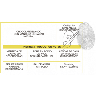 Manteca de cacao (36%), leche en polvo (vaca) (31%), azúcar de caña ecológica (31%), limón deshidratado (1%) sal Añana (0,5%).