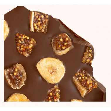 Leche entera en polvo, azúcar, cacao, dados de higos secos (higos, harina de arroz), manteca de cacao, avellanas , chips de higos, jarabe de glucosa, vaina de vainilla Bourbon.