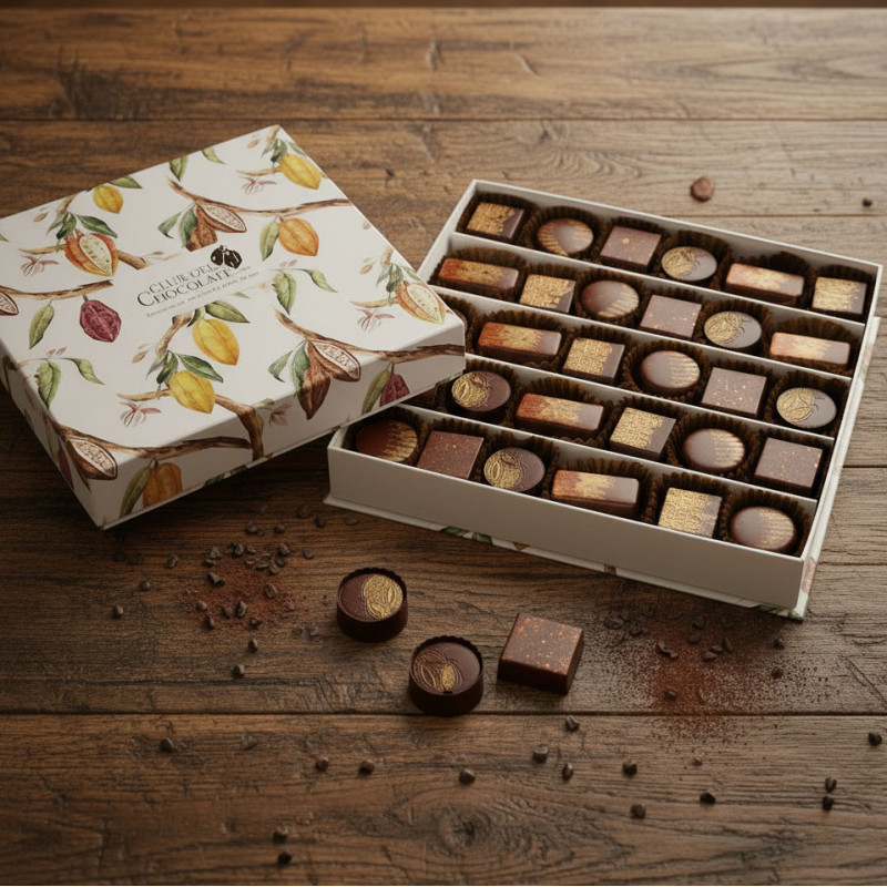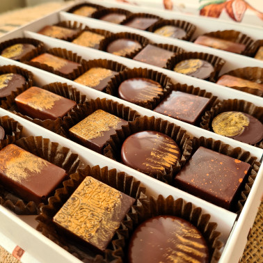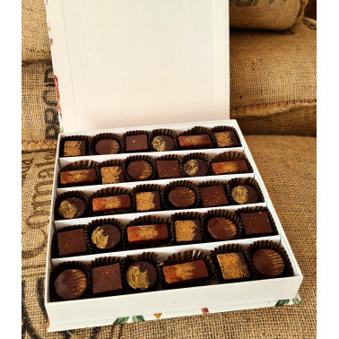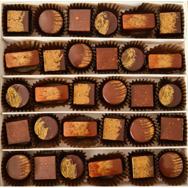 Con esto, nos podemos permitir ofrecer esta caja de 30 bombones en los que hemos combinado las coberturas de origen y los rellenos de ganaches del mismo origen con algún matiz que resalte los sabores propios del cacao. Seguimos así la tradición de la alta bombonería francesa donde se pone en valor el matiz del cacao y se complementa con especias para realzar las notas propias.
