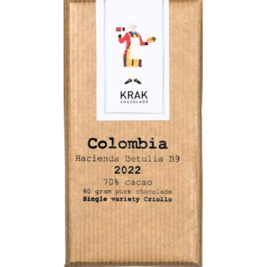 En la Región de Antioquía, recorrida por una de las sierras de los andes colombianos, se encuentra Hacienda Betulia, muy reconocida en el chocolate bean to bar por su cacao aromático. Son cacaos criollos recuperados con notas frutales. En este caso, el B9 es un cacao que nos recuerda piña madura y que se elabora por Mark Schimmel en el obrador de Krak al 70%, dando lugar a un chocolate afrutado y dulce.