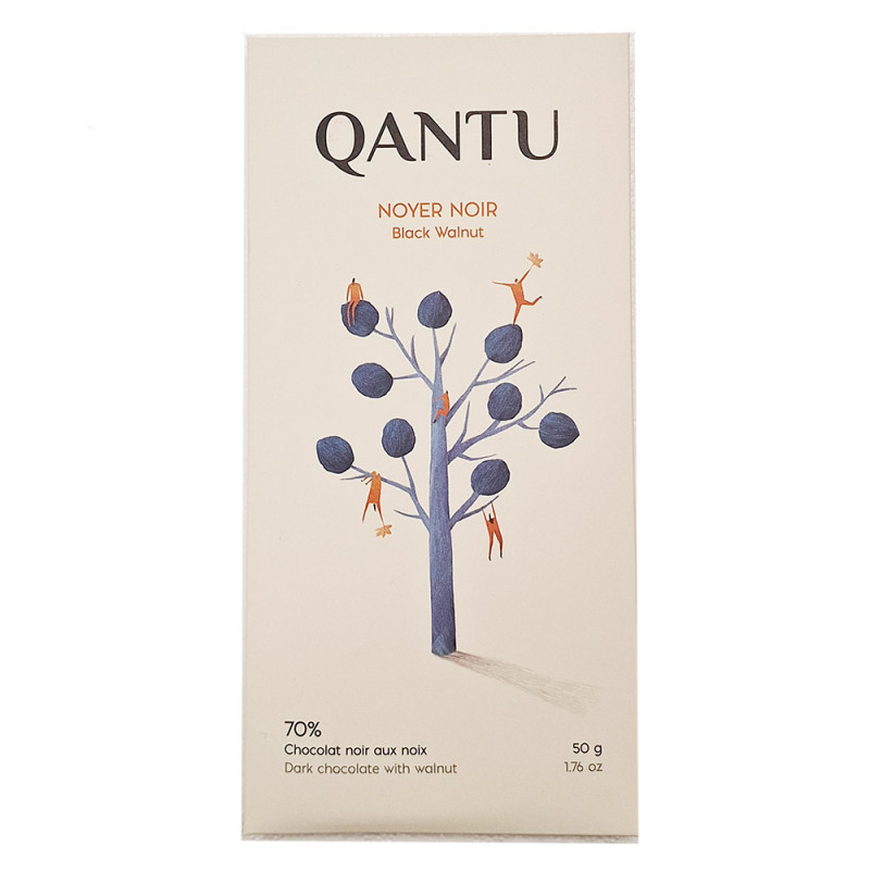Normalmente un buen cacao elaborado bajo el proceso bean to bar no lleva un fruto seco básico, si lo lleva es de alta calidad. Pués a esta cacao de Bagua, tan aromáticos, Qantú le añade nuez negra de Canadá caramelizada.