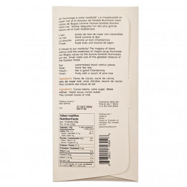 Nos lo describen así: "¡Un homenaje a nuestra esencia nórdica! La majestuosidad del nogal negro y la dulzura del jarabe de arce iluminan nuestro cacao Bagua como la aurora boreal ilumina nuestro cielo. Huele y saborea uno de los mayores tesoros del bosque quebequense.
