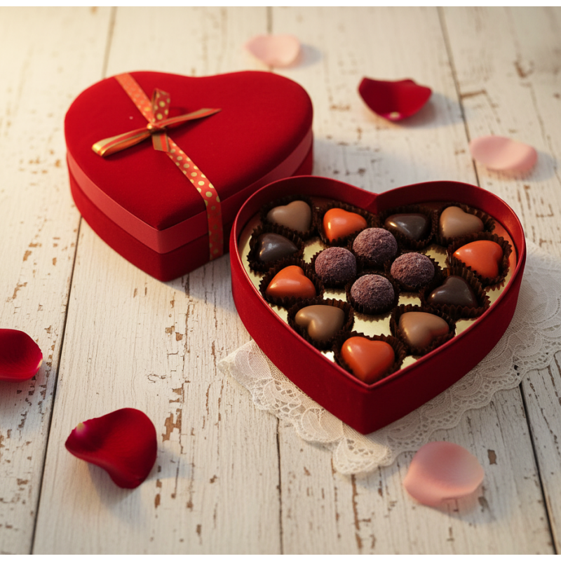 Celebra cualquier ocasión que lo merezca con esta elegante caja de terciopelo rojo y raso en forma de corazón.